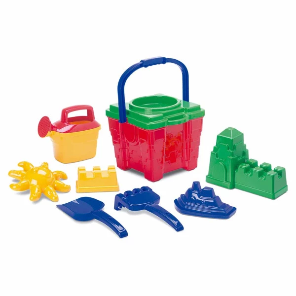• Conteúdo: 1 Balde, 1 Peneira, 1 Pá, 1 Rastelo, 1 Regador e 4 Formas