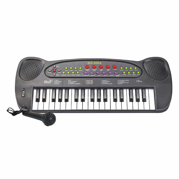 Teclado com Microfone Infantil - HS999 - Preto - DM Toys: esse incrível teclado com microfone da DM TOYS é perfeito para as crianças iniciarem sua carreira musical. Incentive o talento musical com o Teclado HS-999 com diversas funções. Possui 37 teclas e sons de 8 instrumentos, 8 ritmos e sons de percussão e samba. Tem 22 músicas demonstrativas para acompanhar soltando a voz.